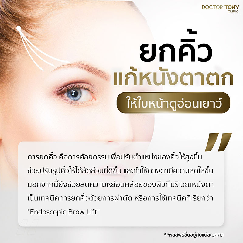 การยกคิ้วจะช่วยปรับรูปคิ้วให้ได้สัดส่วนที่ดีขึ้น และทำให้ดวงตามีความสดใสขึ้น นอกจากนี้ยังช่วยลดความหย่อนคล้อยของผิวที่บริเวณหนังตา ทำให้ใบหน้าดูเรียบเนียนและอ่อนเยาว์มากยิ่งขึ้น ซึ่งมีหลากหลายเทคนิค เช่น การใช้เทคนิคการยกคิ้วด้วยการผ่าตัด หรือการใช้เทคนิคที่เรียกว่า “Endoscopic Brow Lift” ซึ่งเป็นวิธีที่มีความซับซ้อนแต่ให้ผลลัพธ์ที่ดี ซึ่งจะใช้เทคนิควิธีการอย่างไรก็ขึ้นอยู่กับแพทย์ผู้มีประสบการณ์ซึ่งทำหน้าที่ในการวิเคราะห์และออกแบบการยกคิ้วให้เหมาะสมกับลักษณะใบหน้าของแต่ละบุคคล โดยจะทำการเลือกเทคนิคที่ดีที่สุดเพื่อให้ได้ผลลัพธ์ที่สวยงามและเป็นธรรมชาติ